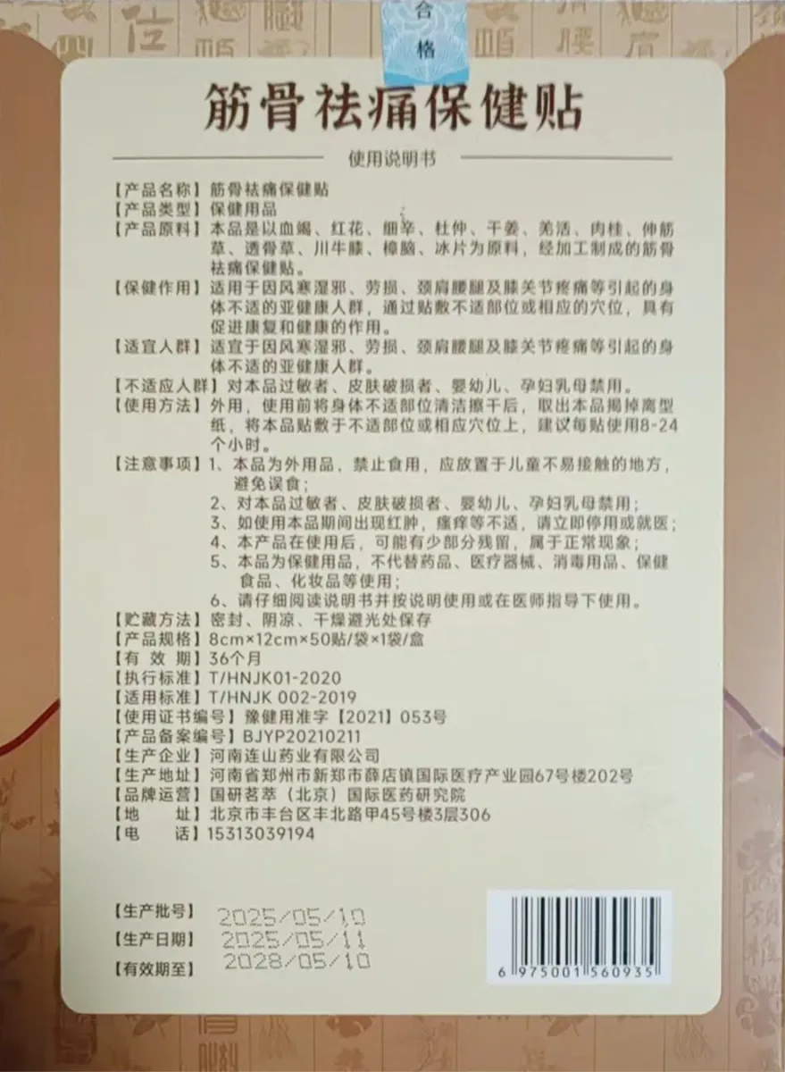 【产品原料】本品是以血竭、红花、细辛、杜仲、干姜、羌活、肉桂、伸筋草、透骨草、川牛膝、樟脑、冰片为原料,经加工制成的筋骨祛痛保健贴。